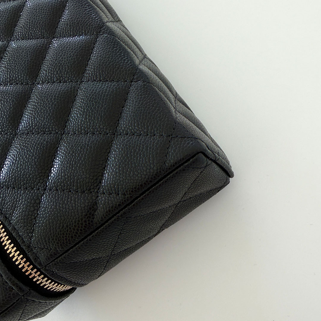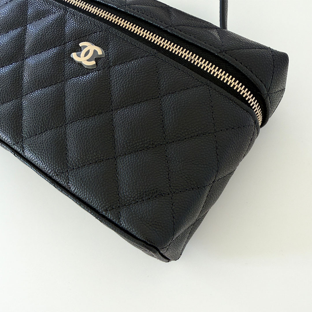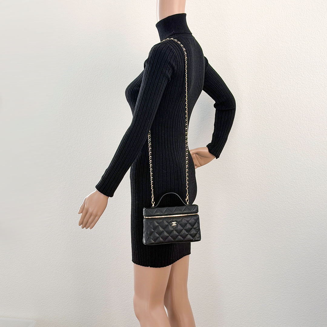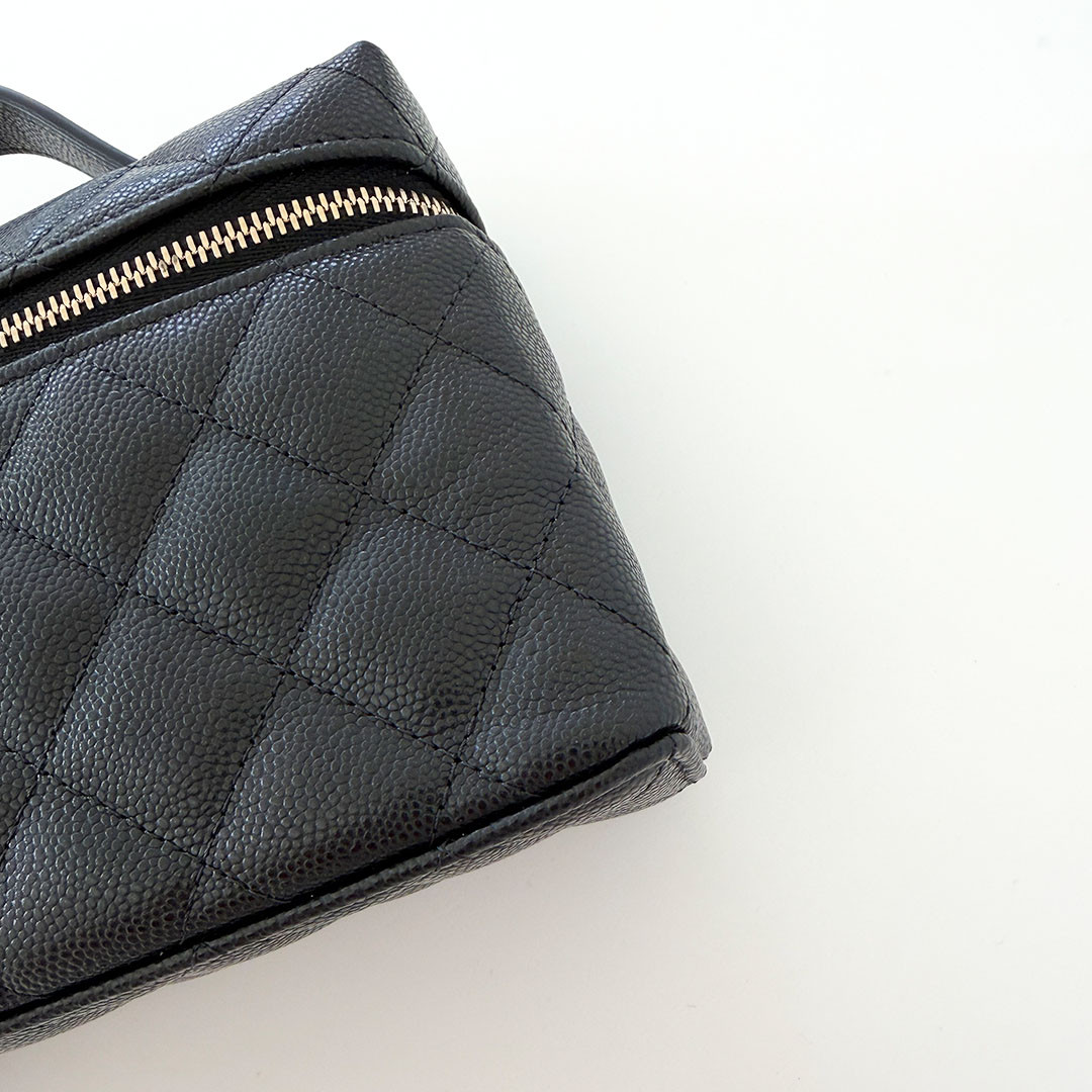 The CHANEL Vanity Top Handle Bag with Chain 26C Black Quilted Caviar. Crafted from luxurious black leather, it features a chain-threaded leather strap that offers versatility in styling, so you can wear it over your shoulder, cross-body, or carry it elegantly by the top handle. The light gold hardware and the classic CHANEL quilting add a timeless touch to the contemporary design.