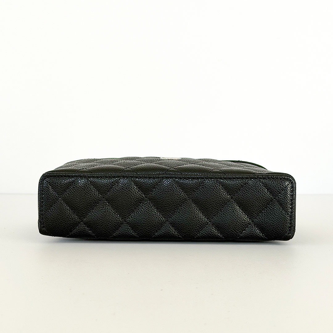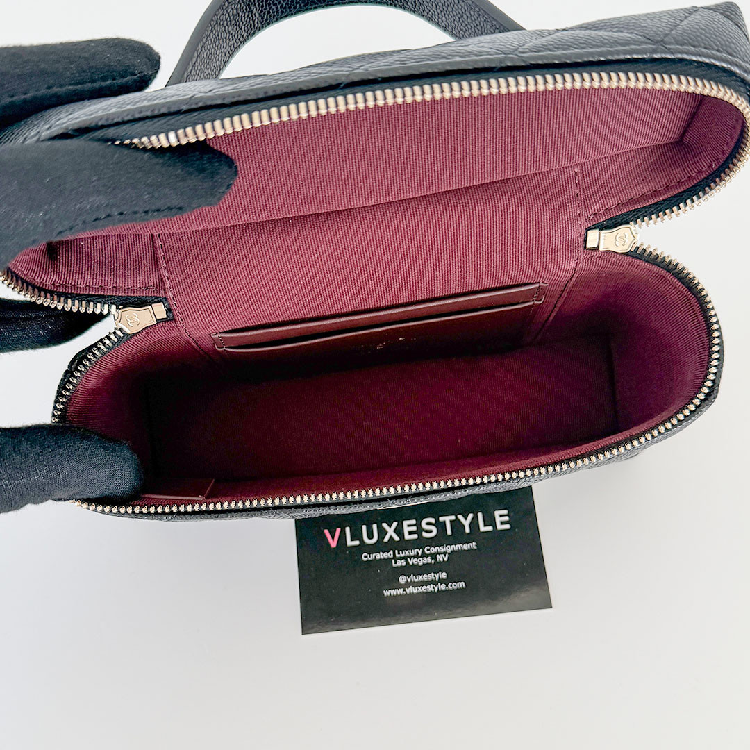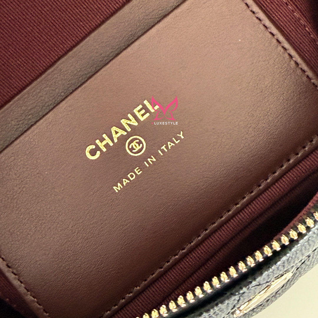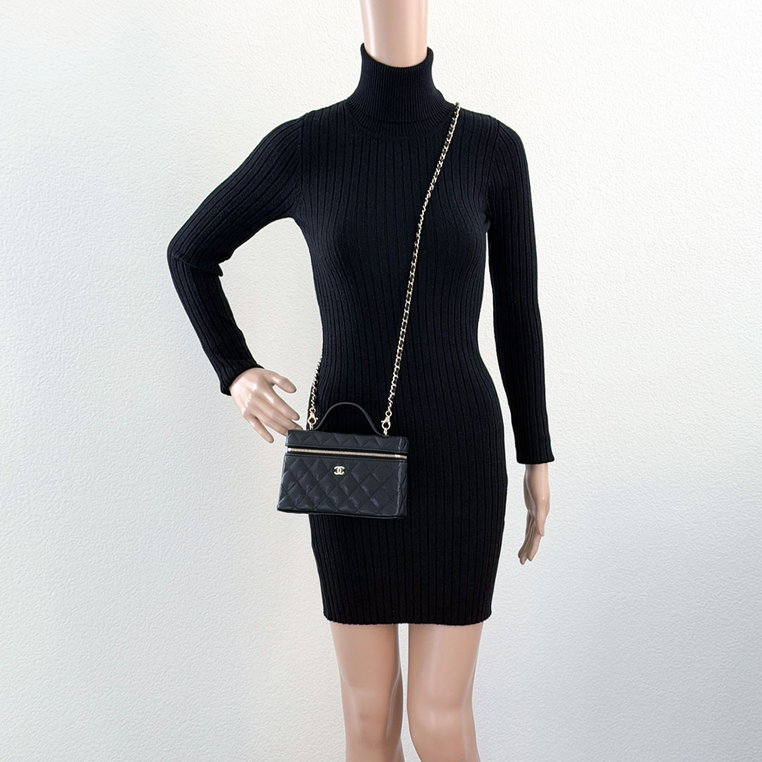 The CHANEL Vanity Top Handle Bag with Chain 26C Black Quilted Caviar. Crafted from luxurious black leather, it features a chain-threaded leather strap that offers versatility in styling, so you can wear it over your shoulder, cross-body, or carry it elegantly by the top handle. The light gold hardware and the classic CHANEL quilting add a timeless touch to the contemporary design.