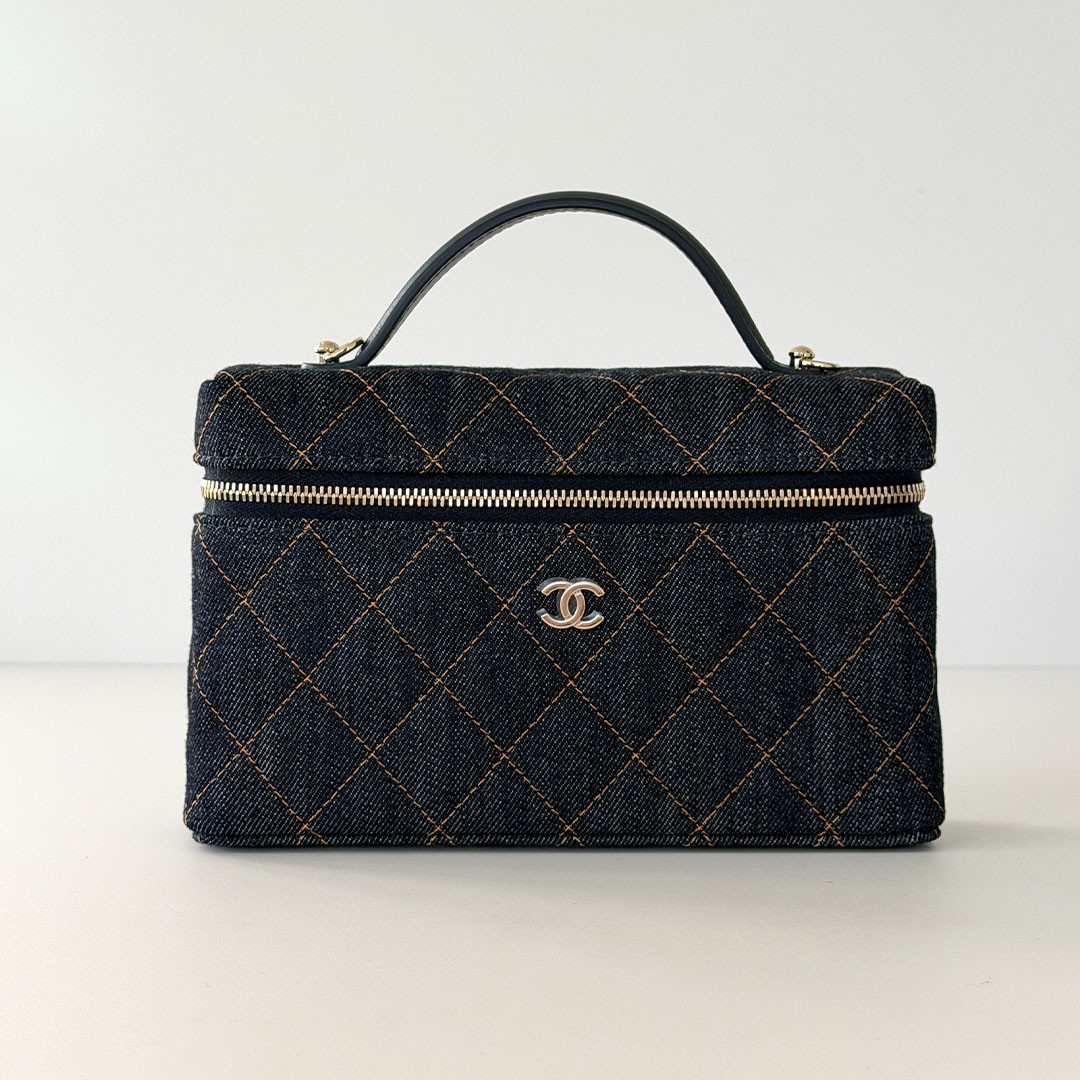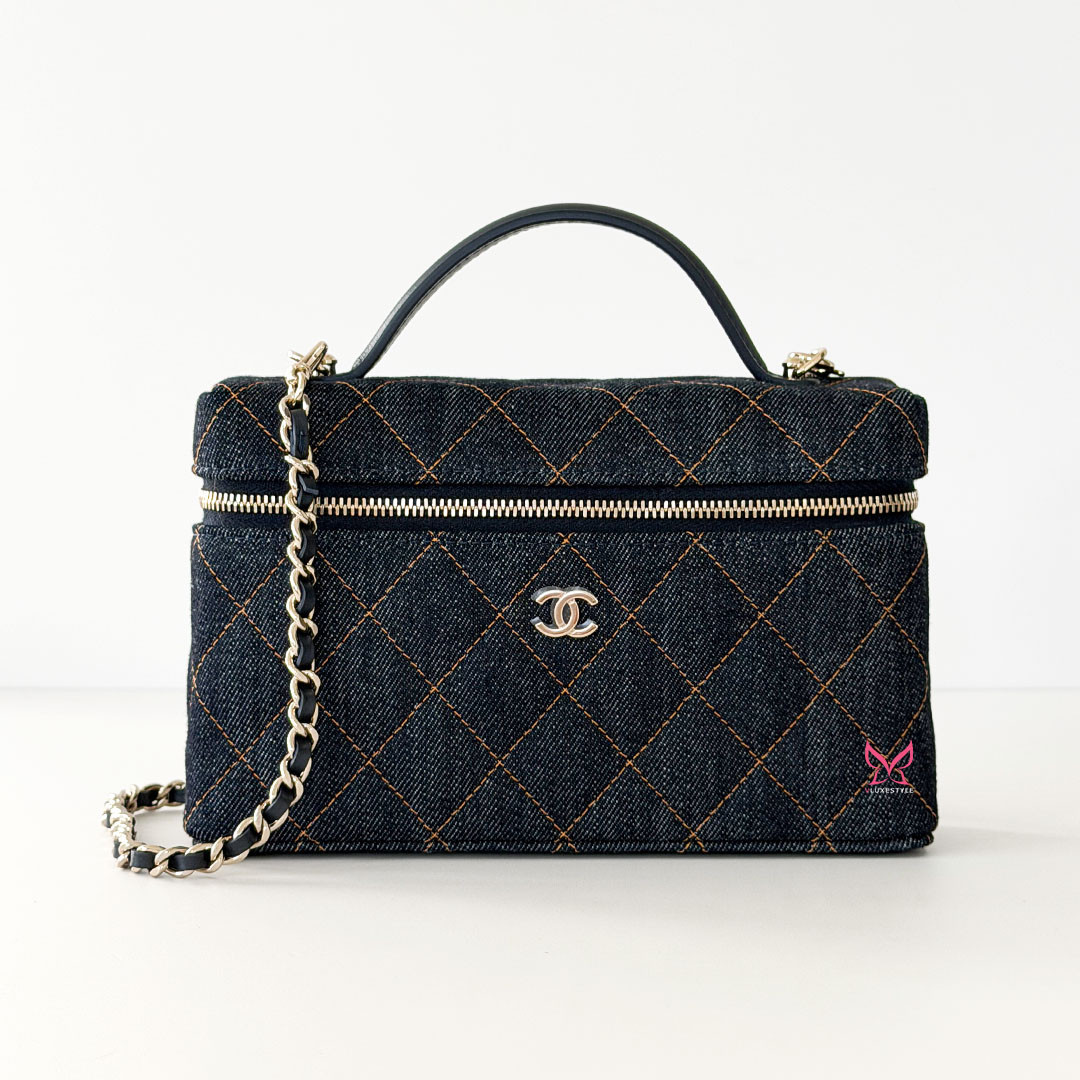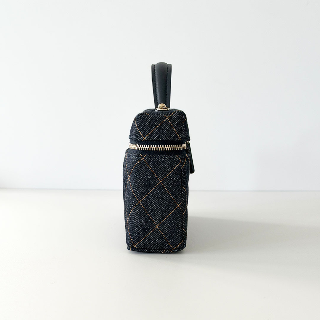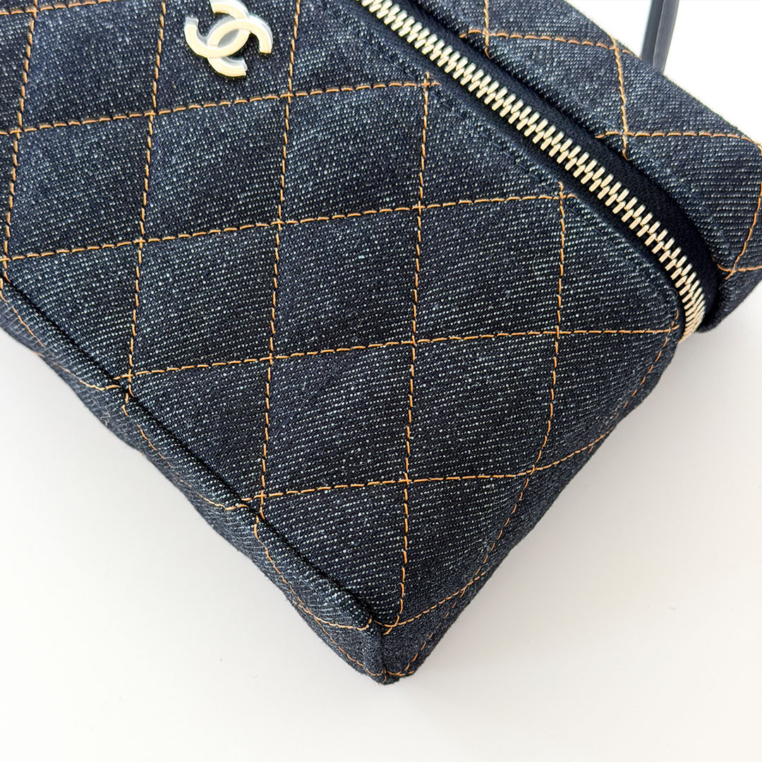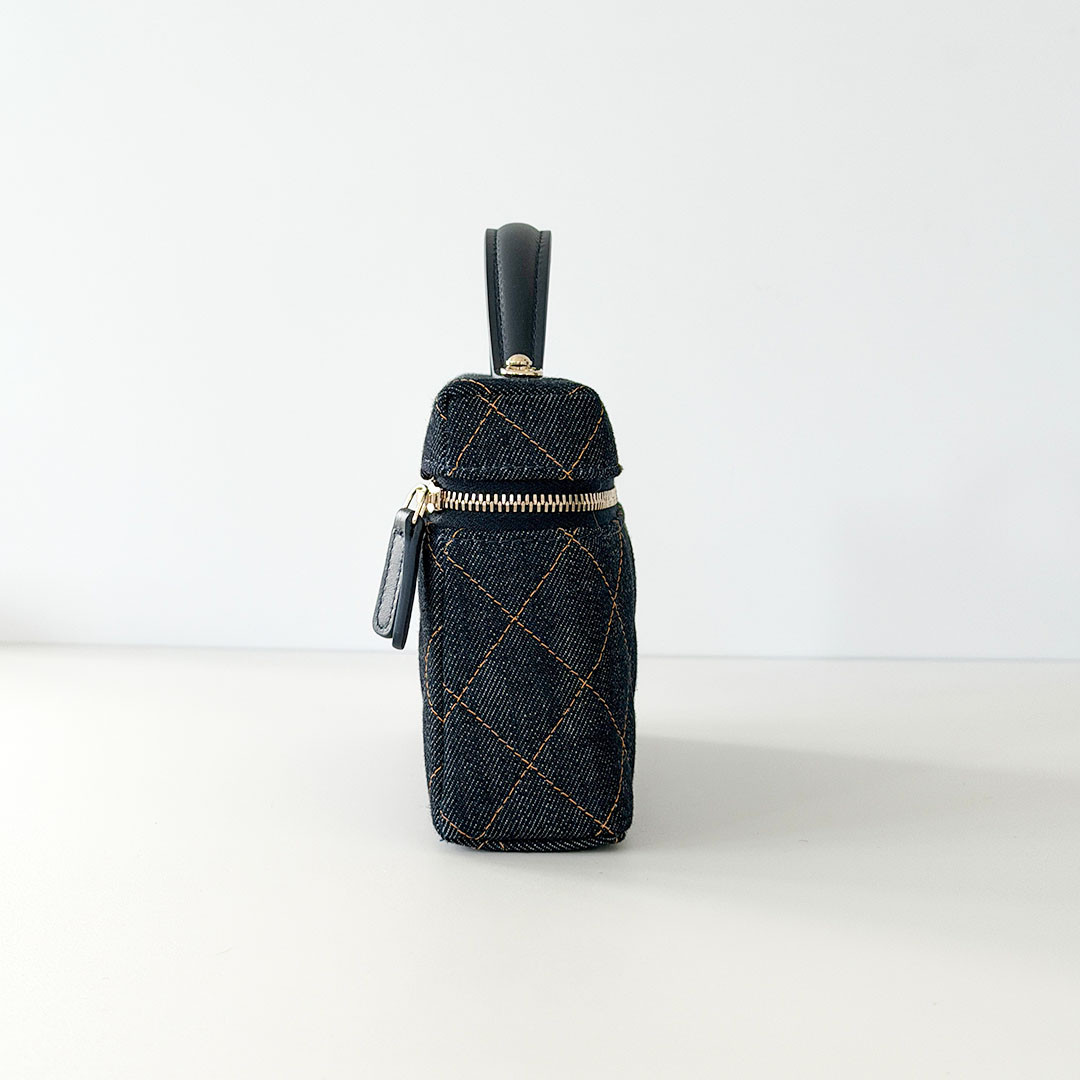 The CHANEL Vanity Top Handle Bag with Chain 26C Denim Quilted Caviar. Crafted from versatile, lightweight denim, it features a chain-threaded leather strap that lets you wear it over your shoulder, cross-body, or elegantly by the top handle. The light gold hardware and the classic CHANEL quilting add a timeless touch to the contemporary design.
