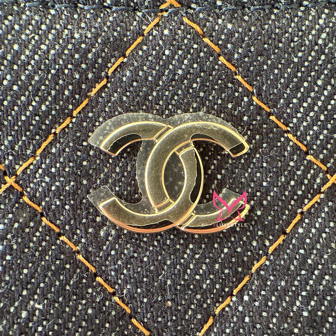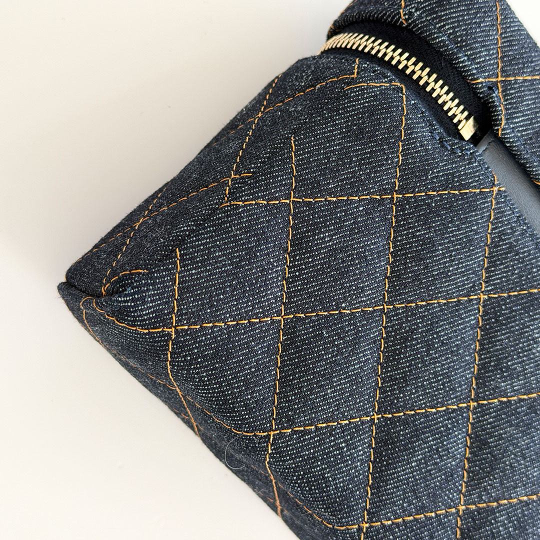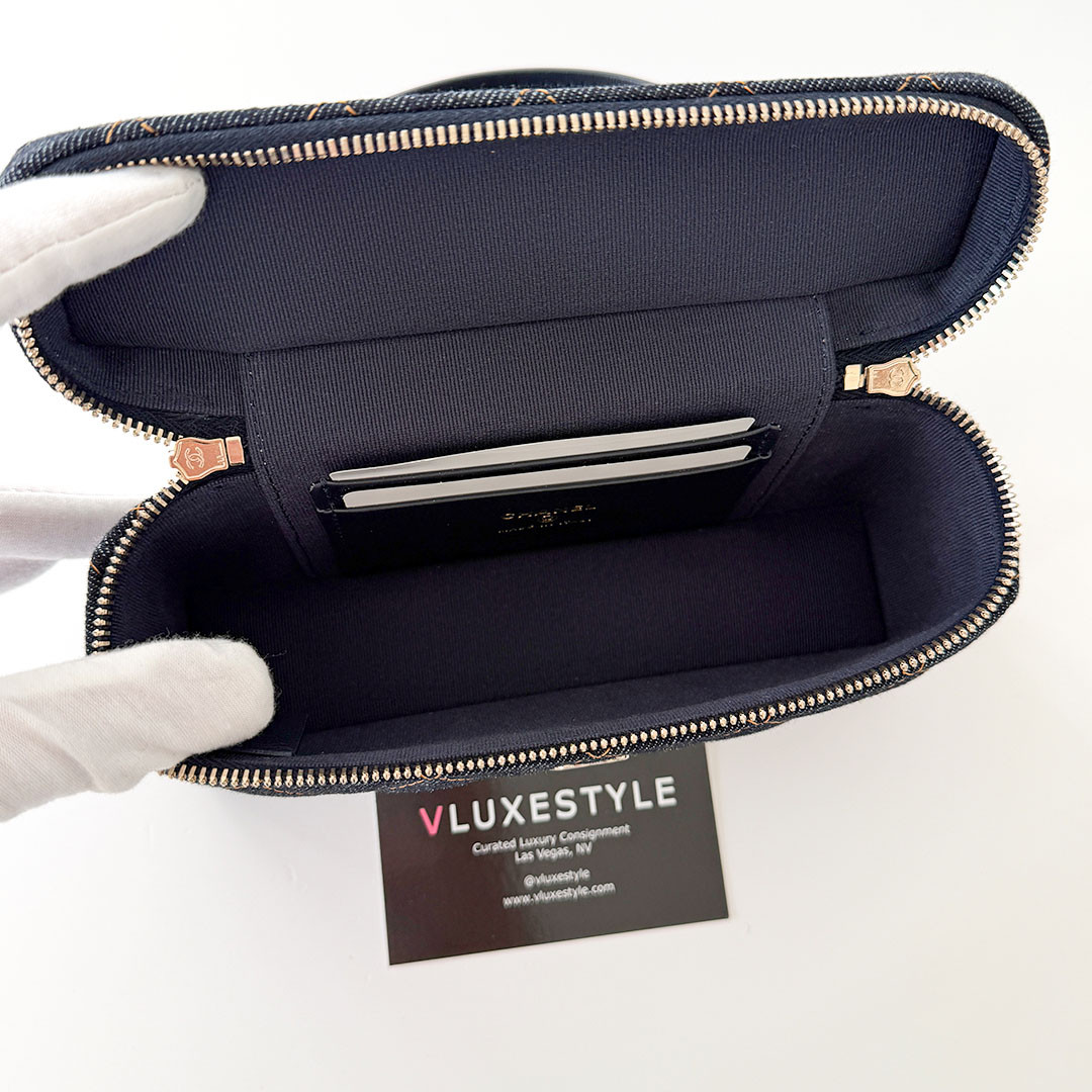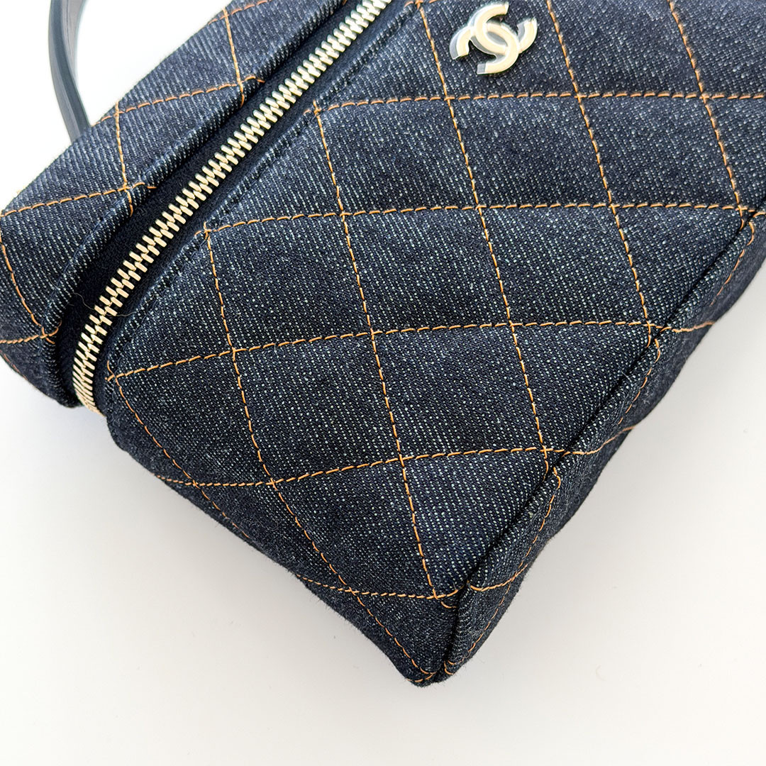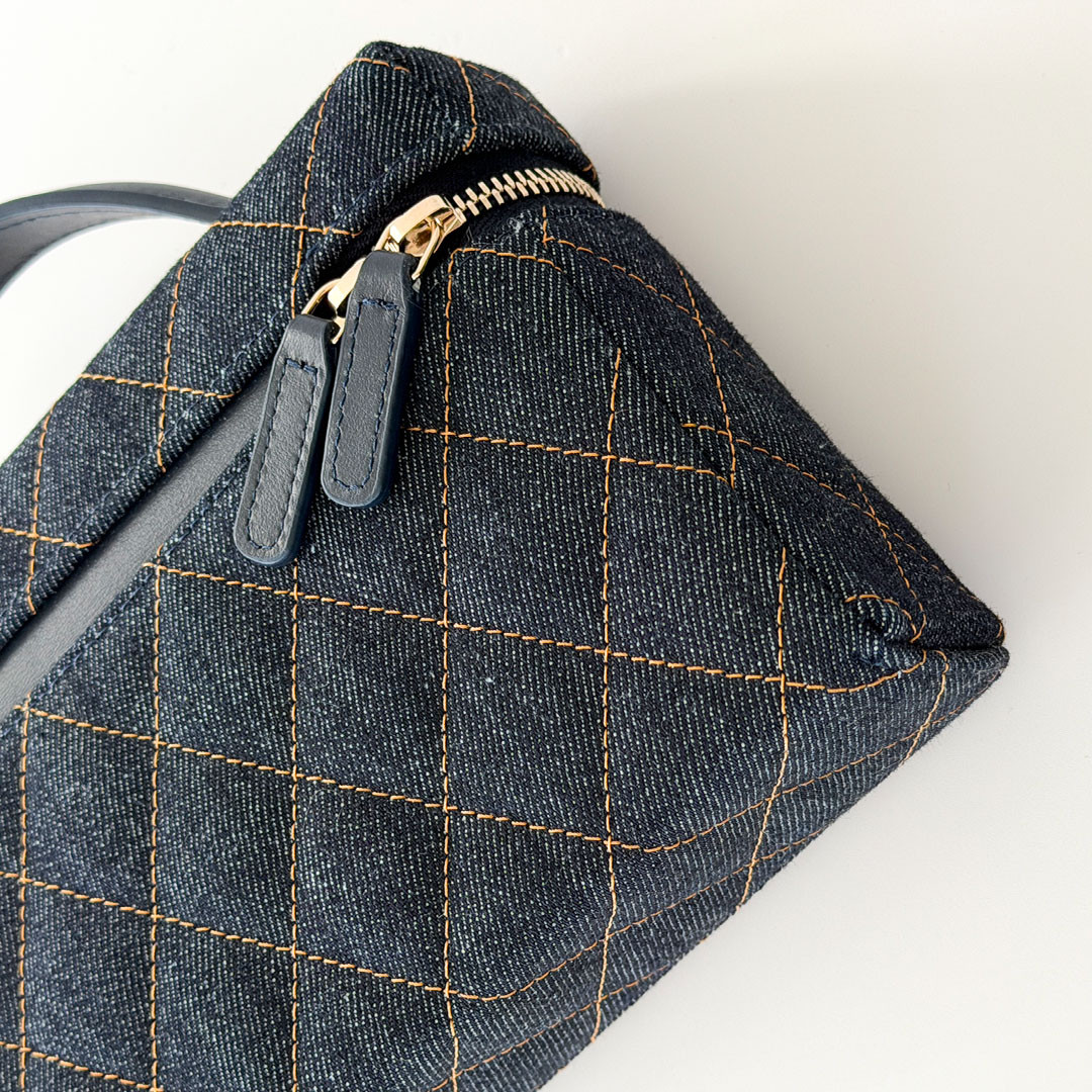 The CHANEL Vanity Top Handle Bag with Chain 26C Denim Quilted Caviar. Crafted from versatile, lightweight denim, it features a chain-threaded leather strap that lets you wear it over your shoulder, cross-body, or elegantly by the top handle. The light gold hardware and the classic CHANEL quilting add a timeless touch to the contemporary design.