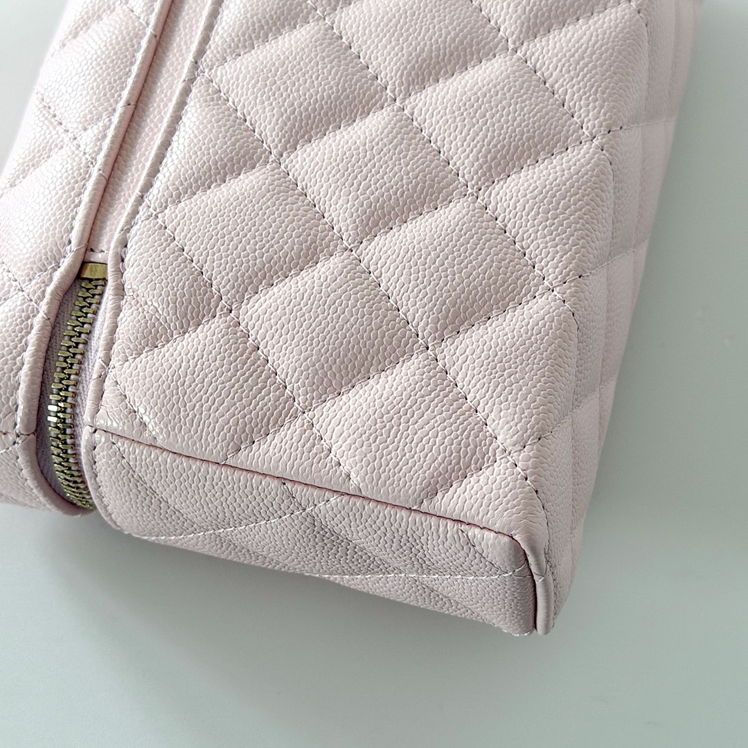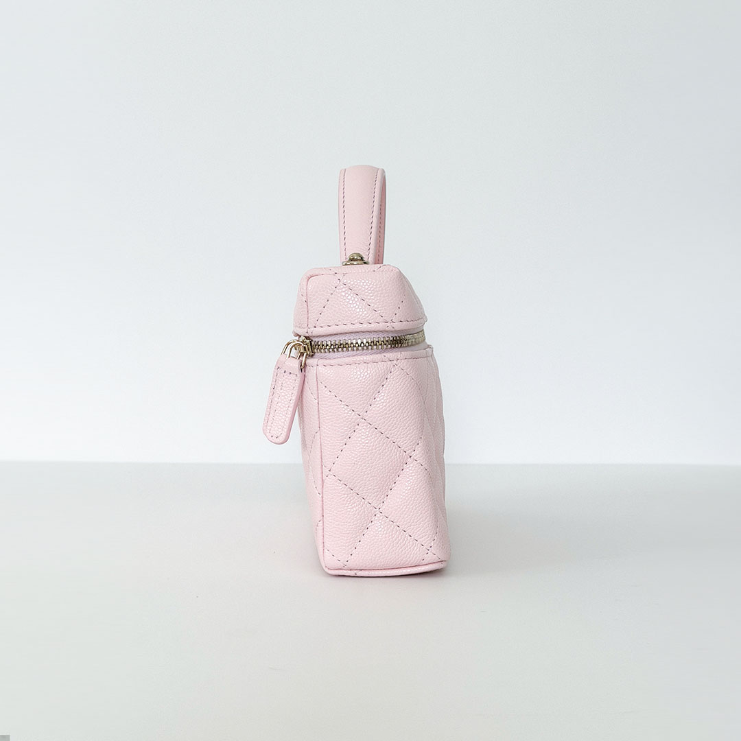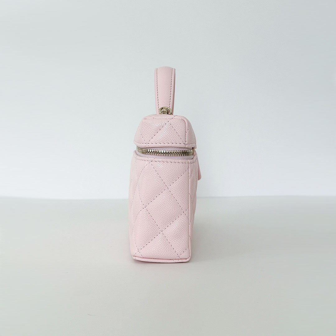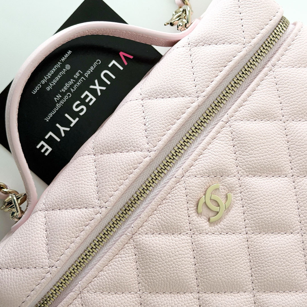 The CHANEL Vanity Top Handle Bag with Chain 26C Light Pink Quilted Caviar. Crafted from luxurious sakura powder pink leather, it features a chain-threaded leather strap that offers versatility in styling, so you can wear it over your shoulder, cross-body, or carry it elegantly by the top handle. The light gold hardware and the classic CHANEL quilting add a timeless touch to the contemporary design.