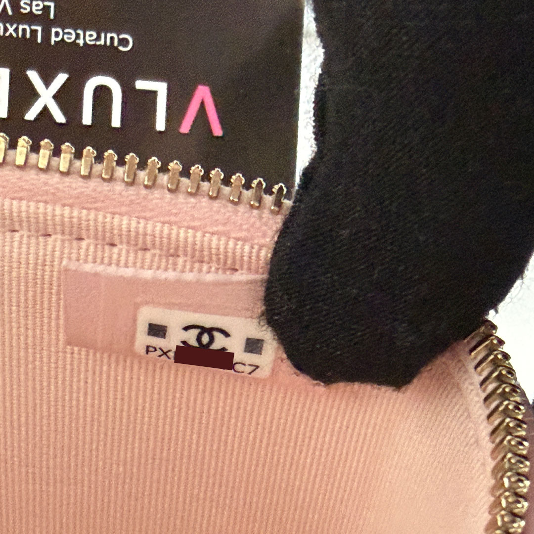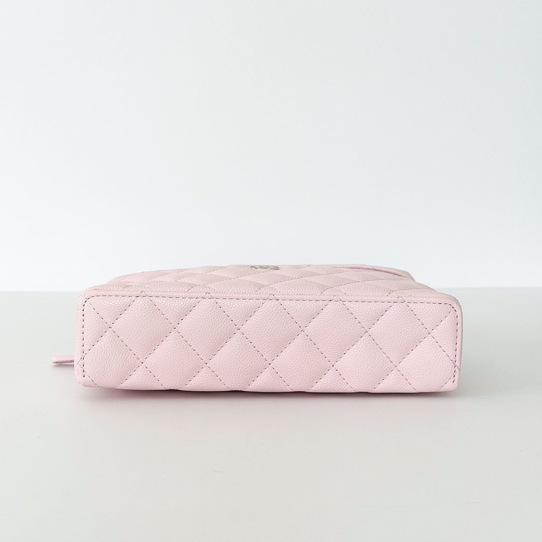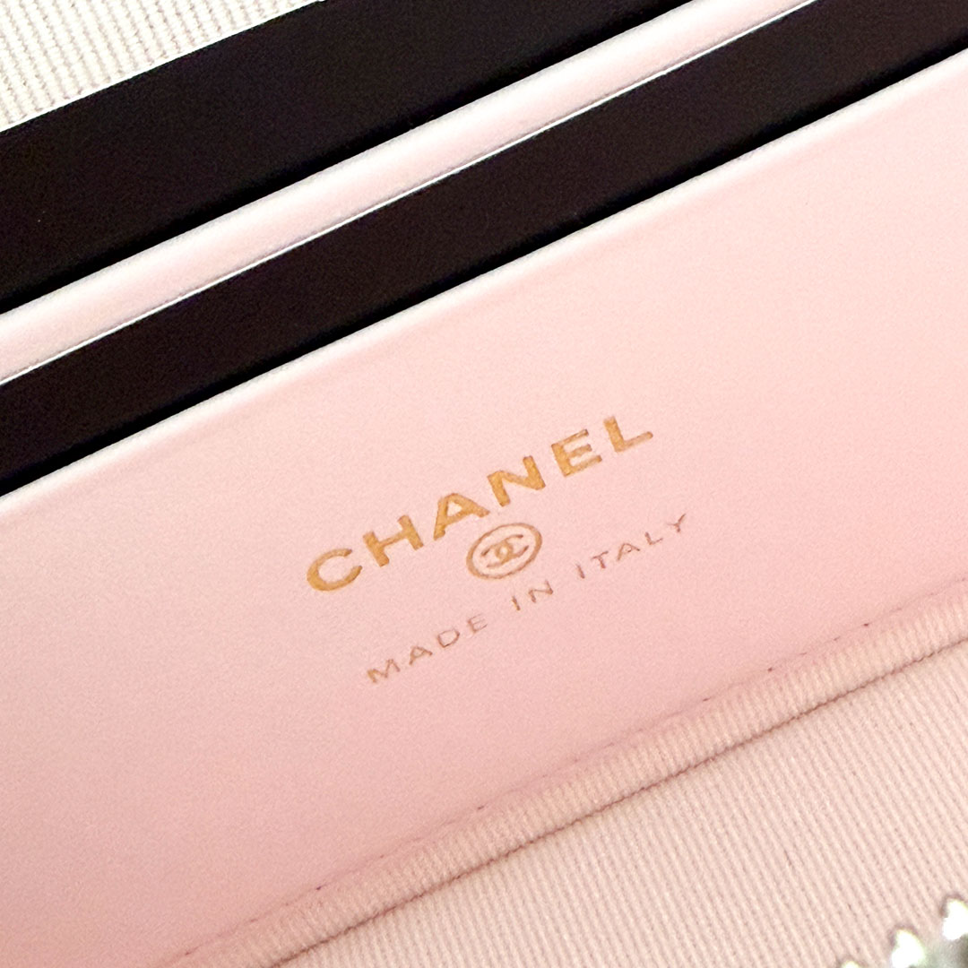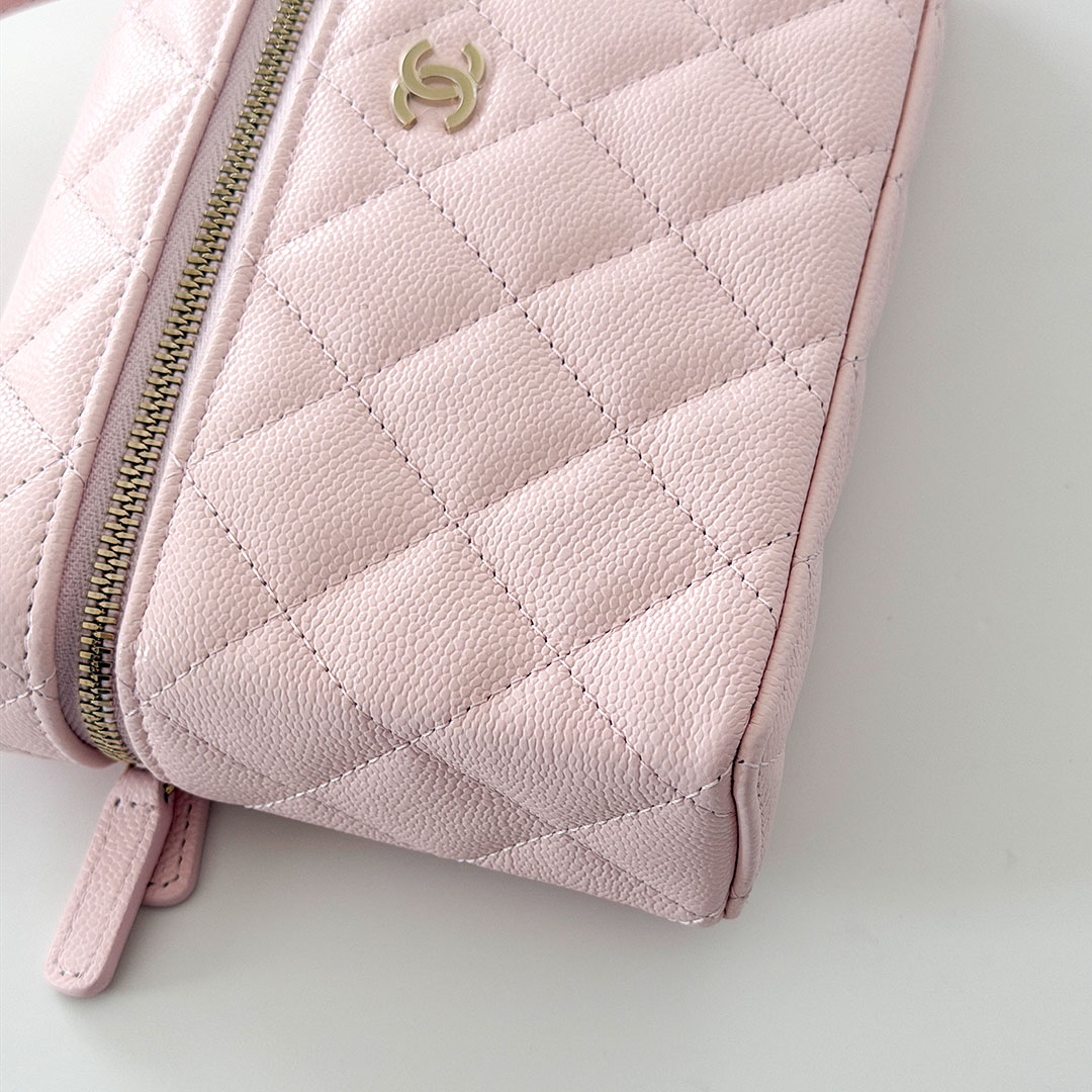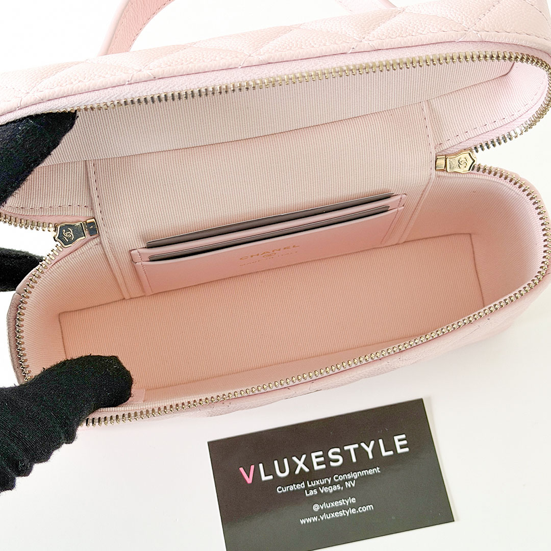 The CHANEL Vanity Top Handle Bag with Chain 26C Light Pink Quilted Caviar. Crafted from luxurious sakura powder pink leather, it features a chain-threaded leather strap that offers versatility in styling, so you can wear it over your shoulder, cross-body, or carry it elegantly by the top handle. The light gold hardware and the classic CHANEL quilting add a timeless touch to the contemporary design.